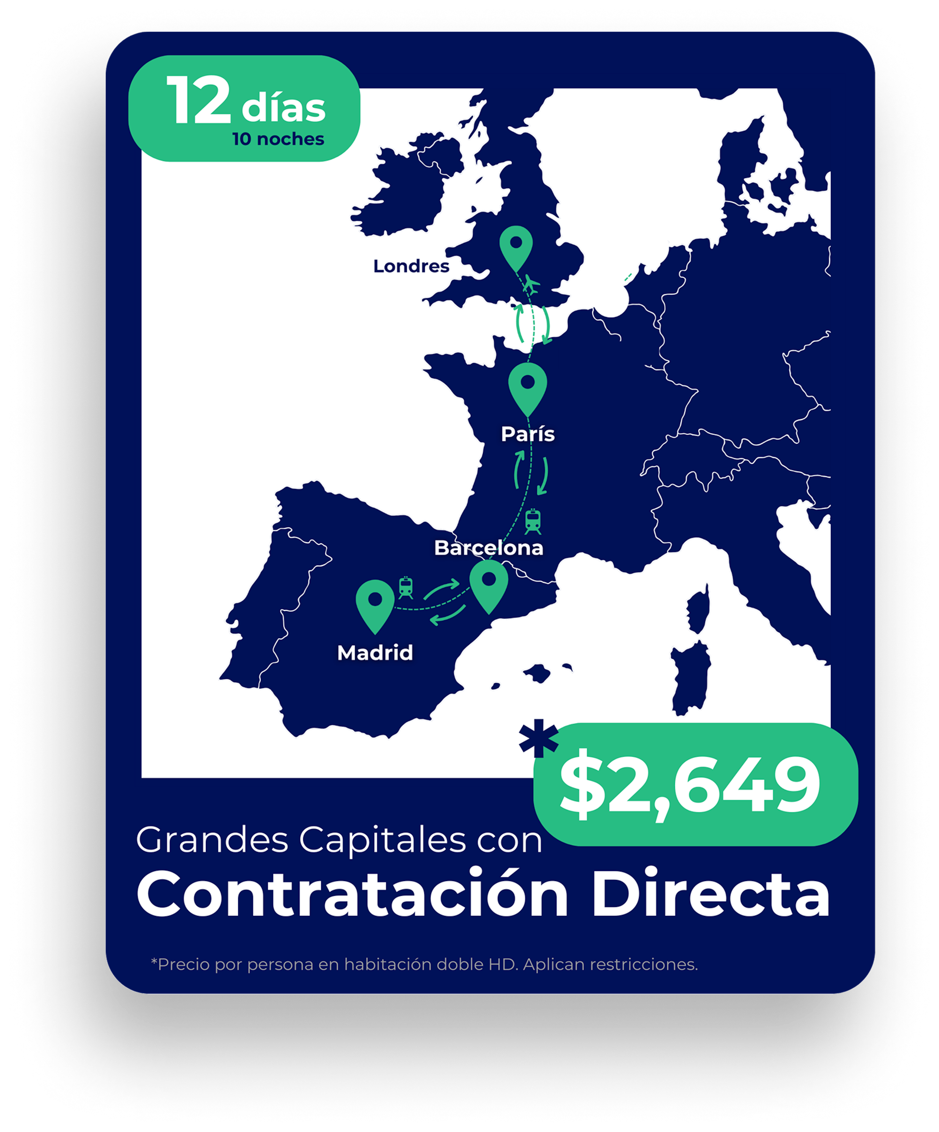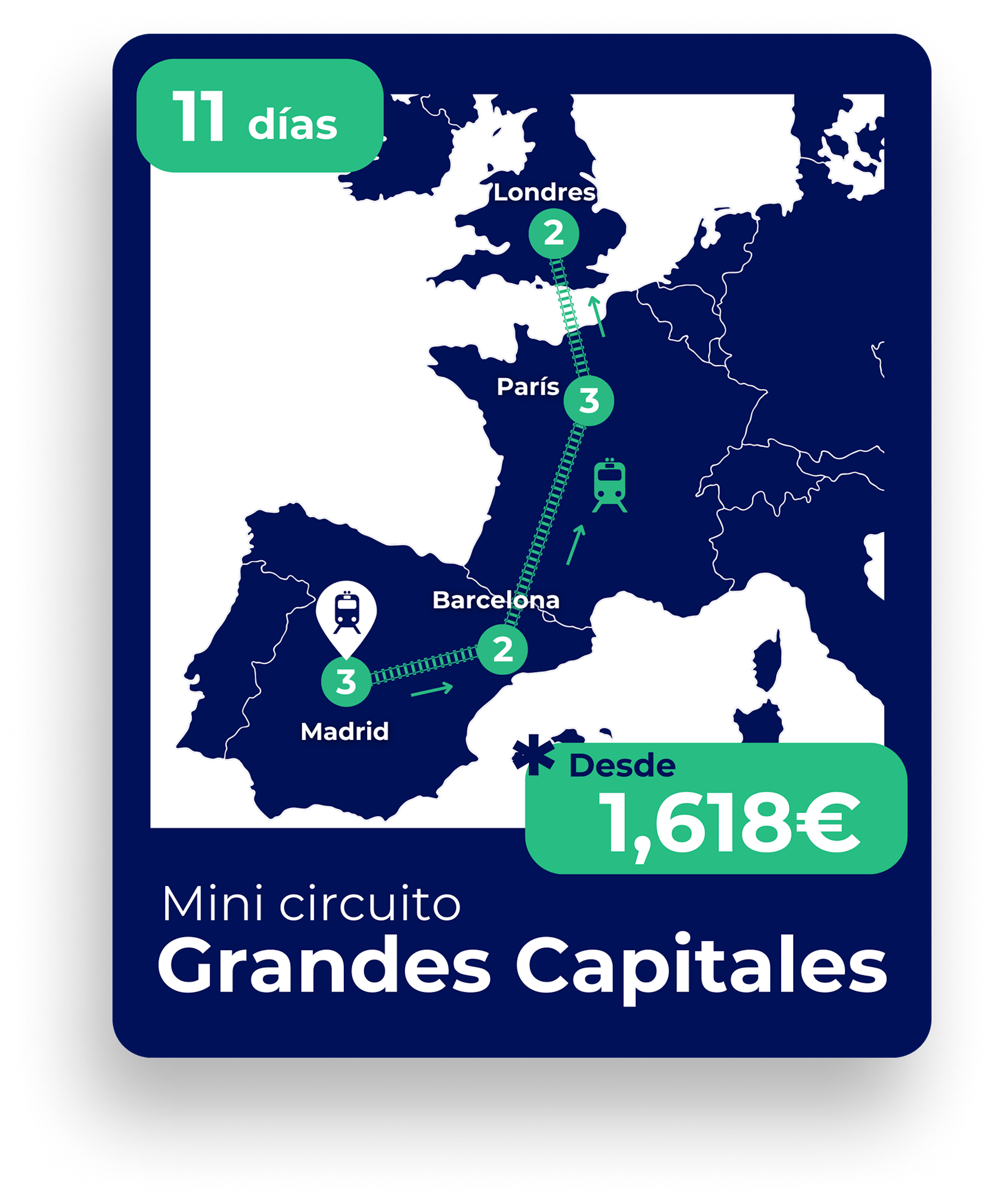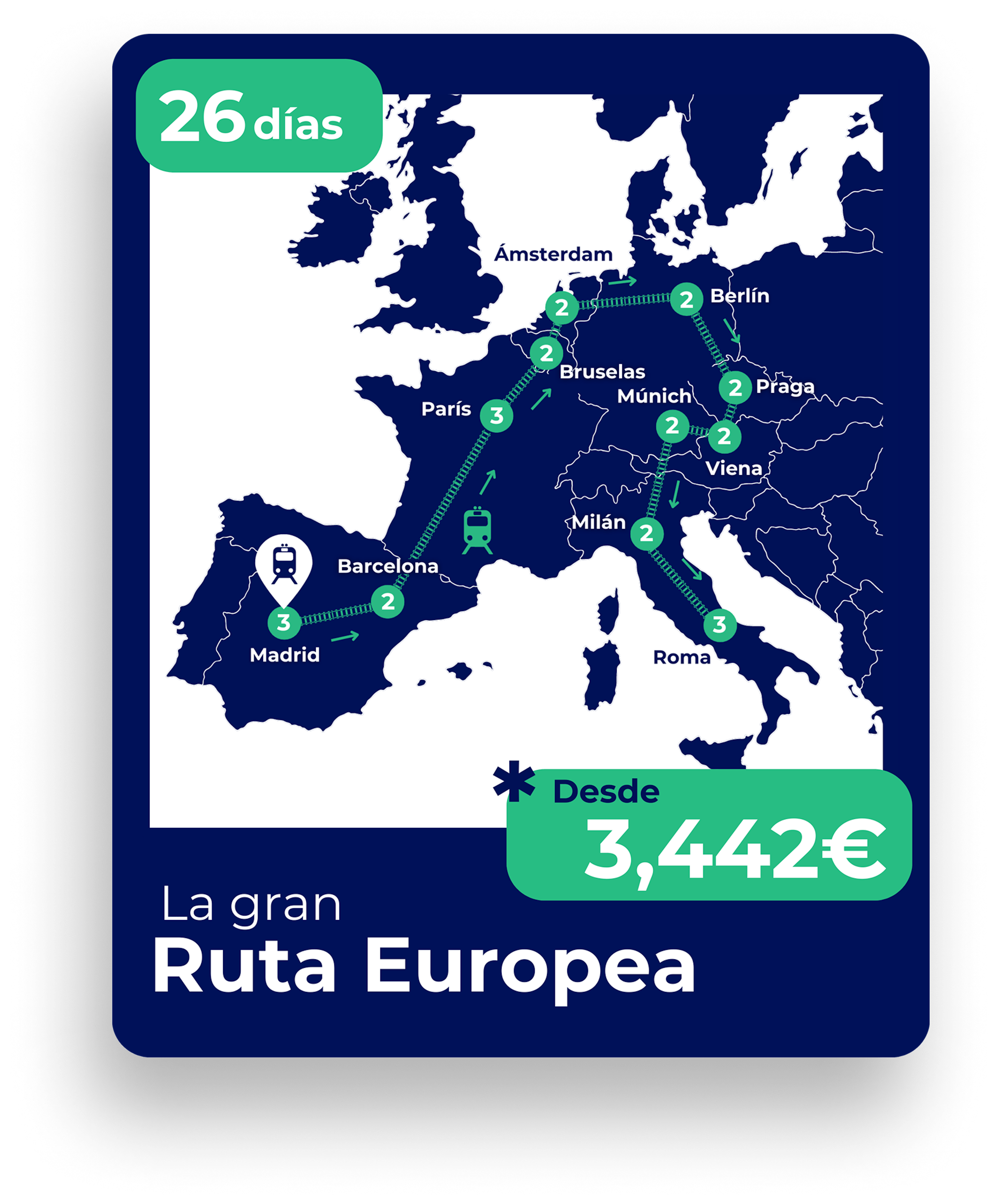 ¿Prefieres algo sencillo y práctico? Con nuestras Rutas de Contratación Directa puedes reservar tu viaje de inmediato, con precio fijo. Tú eliges cuántas noches pasar en cada ciudad y en qué sentido recorrer Europa, sin complicaciones y con toda la comodidad del tren.